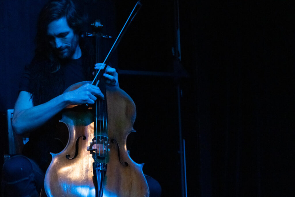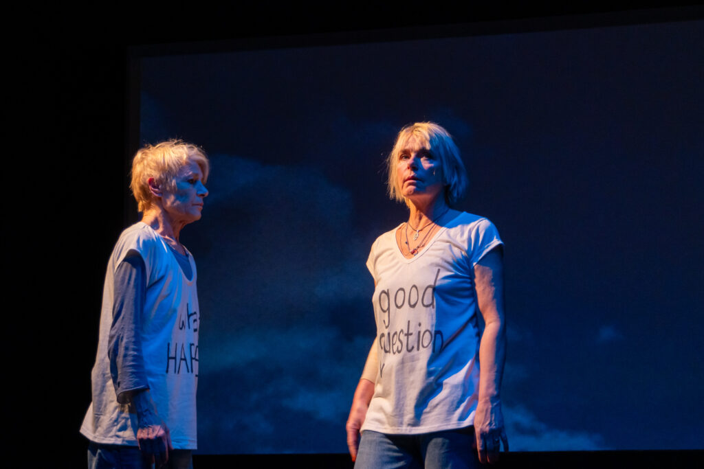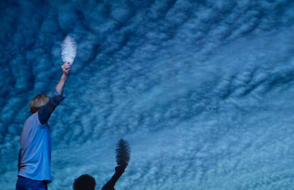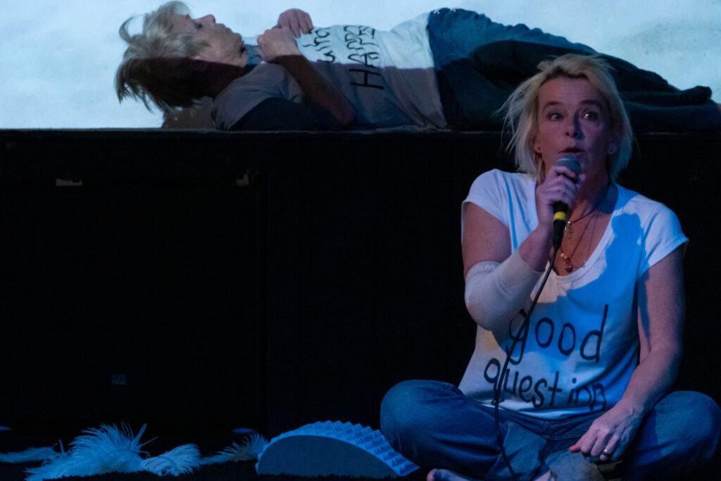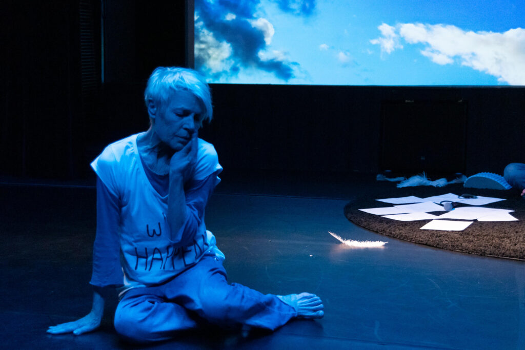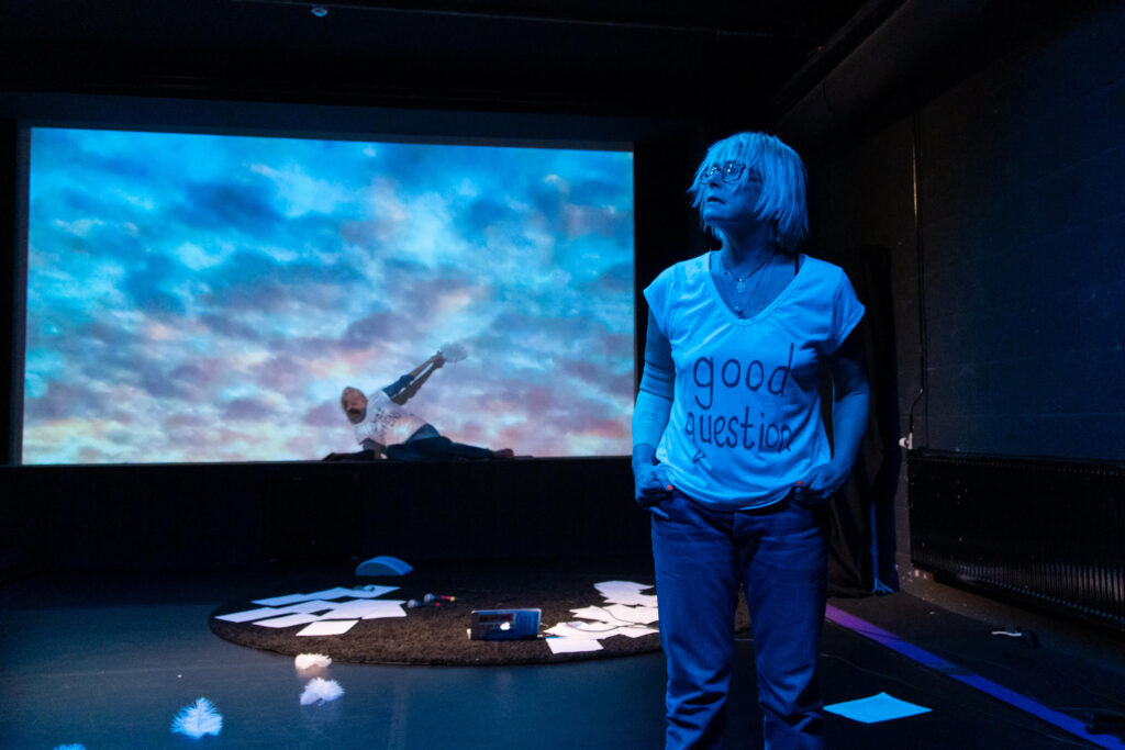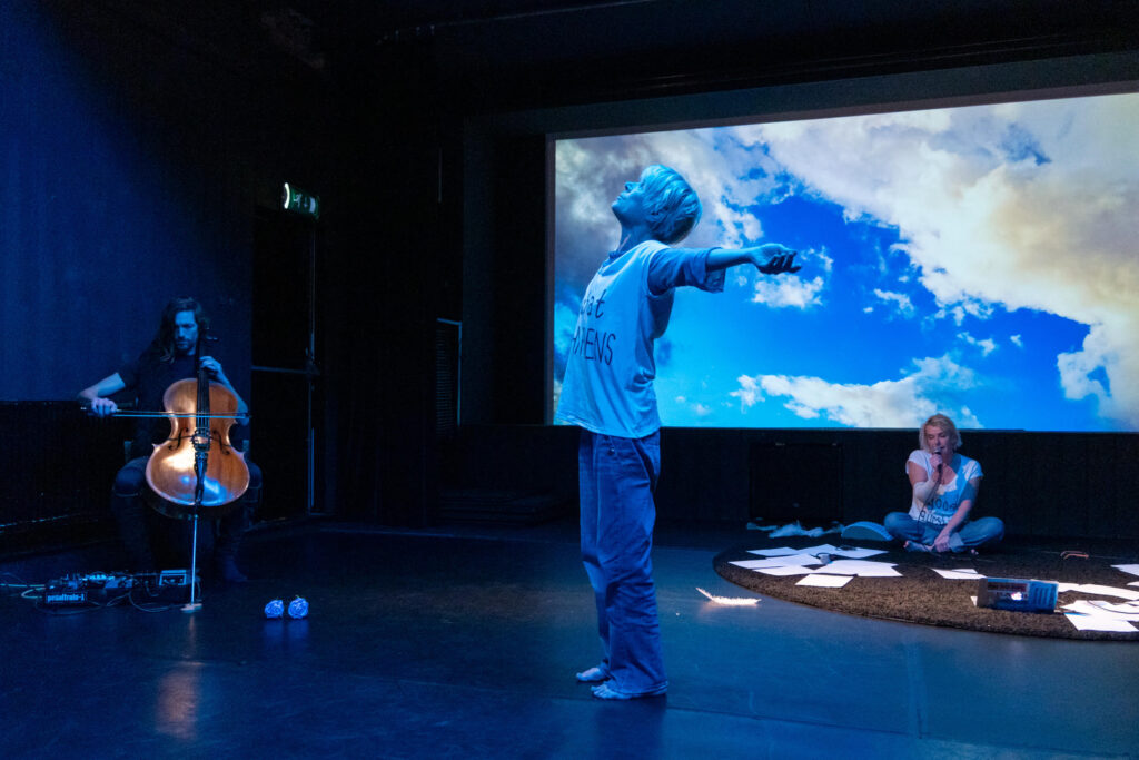 ‘SKY” is performed with text, movement, live music and a film that fills the room with silent, slow moving images of skies. With a laptop in the space, Katie and Sharon develop their text challenging AI with questions: “What is nothing”? ”Do you have emotions”? “What happens when we die”? They explore ancient stories of skies in tandem and in company with our current cosmic confusion. Their correspondence results in a tender playful dialogue, gently funny, absurd, and not afraid of the dark.